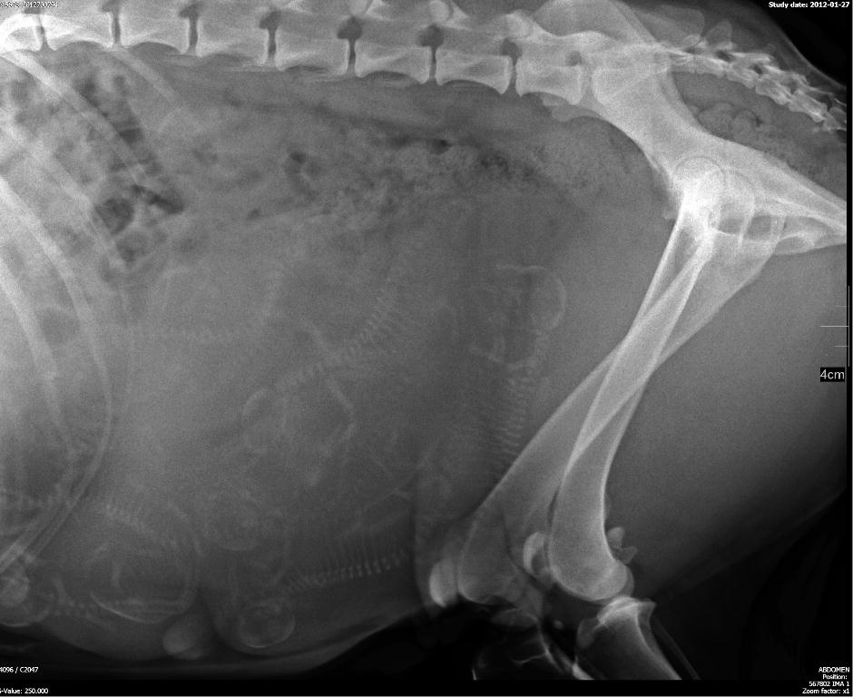 Patrzymy na dostojnie spacerującą, rzadko kawałek podbiegającą, ale głównie śpiącą Achaję. Głaszczemy wielgachny, czasami podskakujący pod ręką brzuszek. Namówieni przez weterynarza (po wielokrotnym zapewnieniu, że jest to bezpieczne) zaglądamy do środka (RTG). Kto policzy z nami?